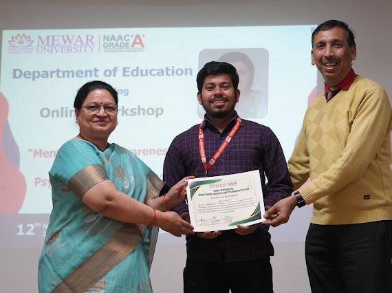 The Department of Education, Mewar University successfully organized a Hybrid Workshop on “Psychological First Aid, Identification of Warning Signs, Response to Self-Harm, and Referral Mechanism” on 12th November 2025 at 3:30 PM.