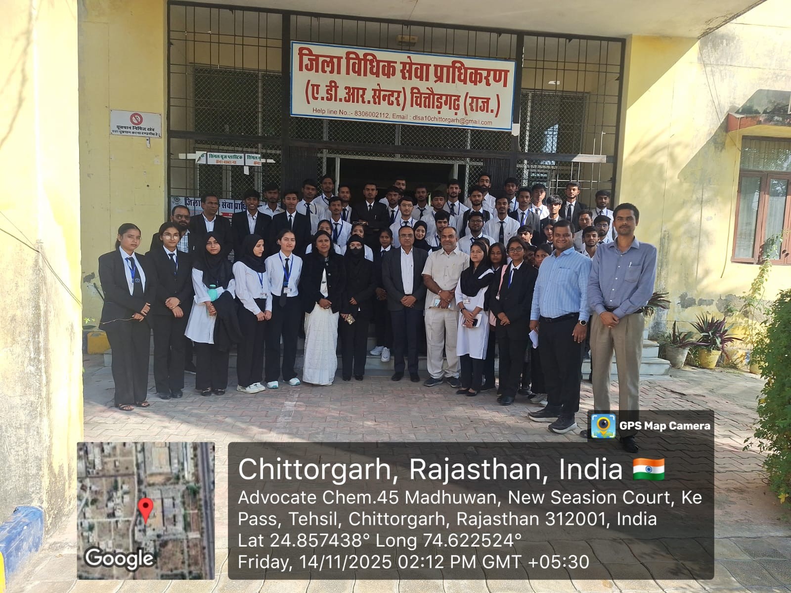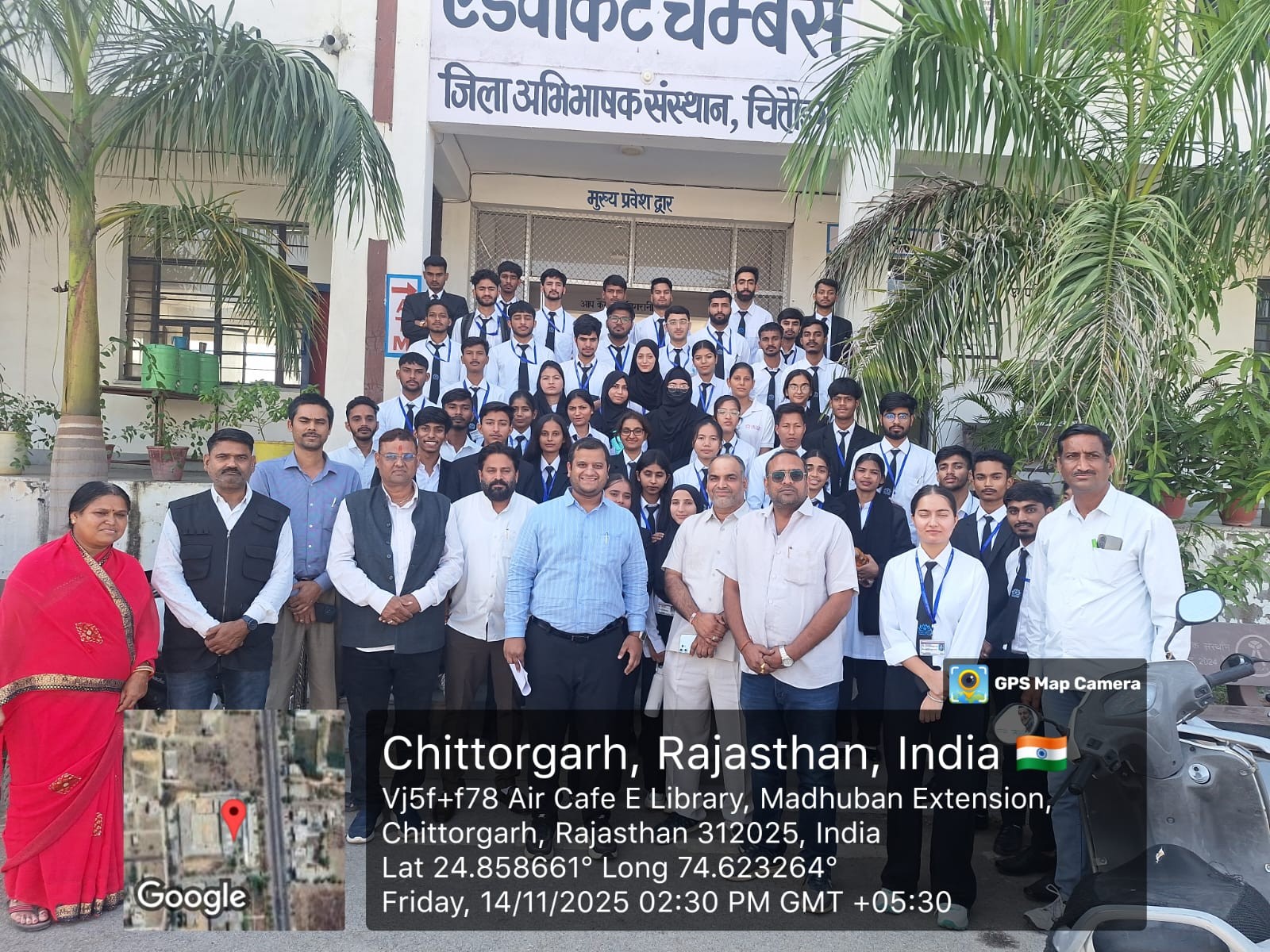 Upon arrival, the students and accompanying faculty members were warmly welcomed by Advocate S. P. Singh, President, District Bar Association, Chittorgarh. He interacted with the students, briefed them on the structure of the district judiciary, and highlighted the importance of courtroom ethics and legal professionalism.