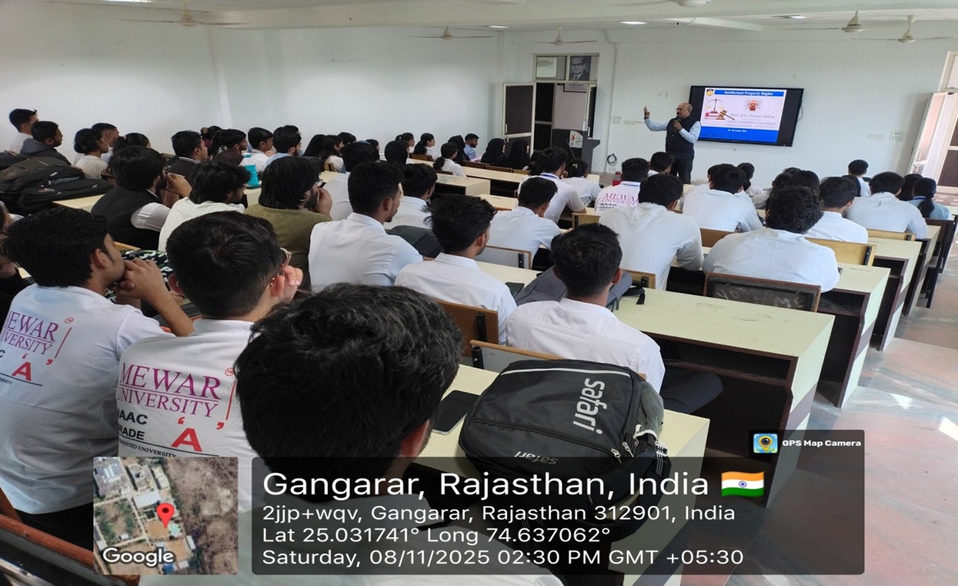 The Faculty of Legal Studies, Mewar University, organized a guest lecture on November 8, 2025, as part of its Value Added Course (VAC) lecture series. The lecture was delivered by Dr. Puneet Bafna, Professor, Amity University Rajasthan, who is a well-known academician and researcher in the field of Intellectual Property Rights.