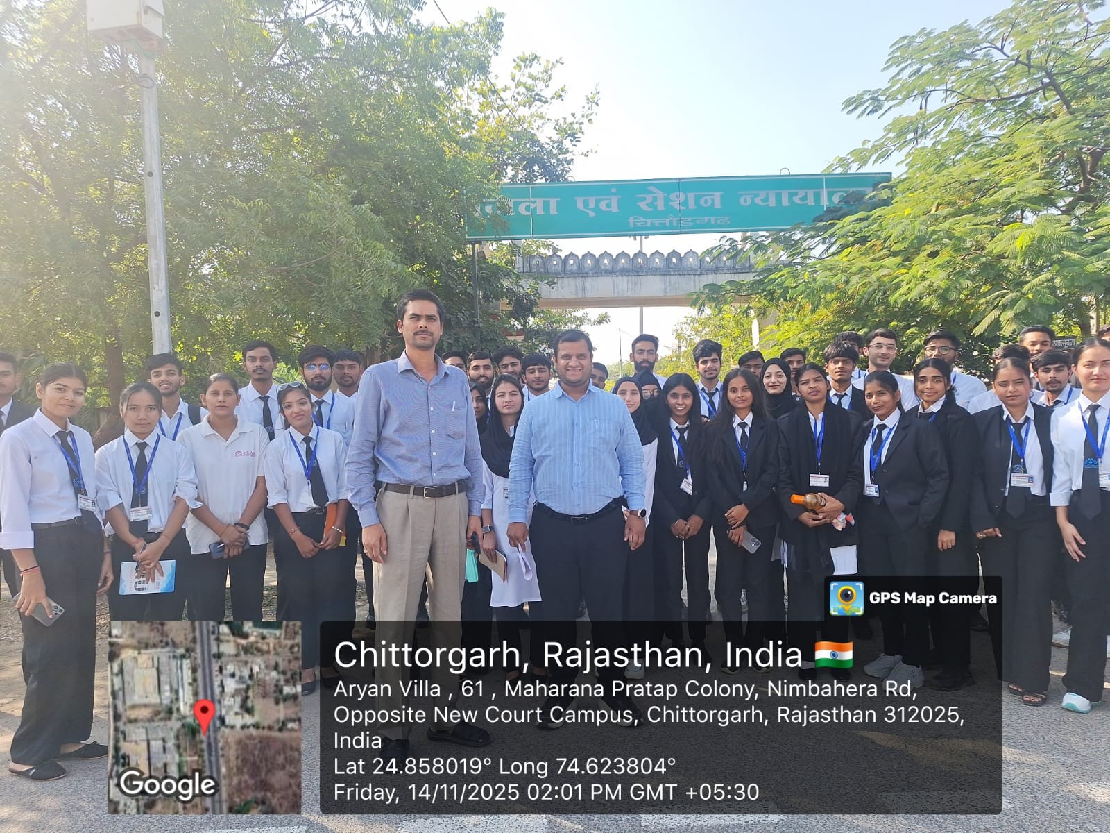 The Faculty of Legal Studies, Mewar University organized an academic visit for the first-year law students to the District & Sessions Court, Chittorgarh on November 14, 2025. The visit aimed to provide foundational practical exposure to the functioning of the judicial system, courtroom procedures, and the working environment of various special courts.