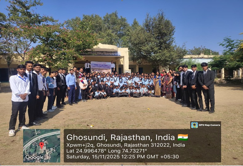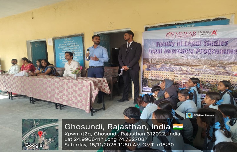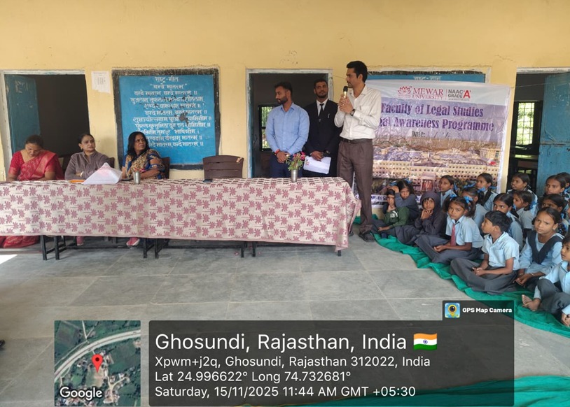 The Faculty of Legal Studies, Mewar University, organized a Legal Awareness Program on 15/11/2025 at Government Senior Secondary School, Baldarkha, Bassi, Chittorgarh, with the objective of sensitizing students and the school teachers about important legal issues. The program focused on spreading awareness regarding the Protection of Children from Sexual Offences (POCSO) Act, 2012, which plays a vital role in safeguarding the rights and dignity of children.