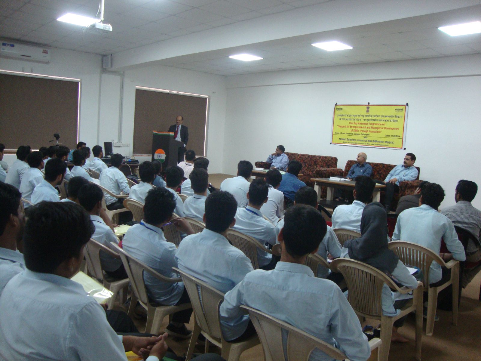 Ministry of Micro, Small &Medium Enterprises (MSME) has conducted a one day program on “Support for Entrepreneurial and Managerial development of SME's through Incubators" under NMCP Scheme at Mewar University on 21St September 2016. In this program Dr. Sushil Kumar, Assistant Director & Shri M.K. Meena, Deputy-Director, MSME-DI, Jaipur have presented their views on how to become an entrepreneur and what are the schemes of government of India to help the young entrepreneur. Also they told that MSME will set up an Incubation Centre in Mewar University for helping the innovative ideas. Prof. Ashish Shah, Pro-Vice Chancellor, Mewar University, discussed the steps taken by Mewar University for the development of entrepreneurship skills in the students of our university. Mr. Harish Gurnani, Director Training & Placement, also addressed the session. Mr. Kapil Nahar, HOD-Mechanical and Mr. V. Shiva, HOD-Electrical coordinated the session. More than 60 students were present in the session.